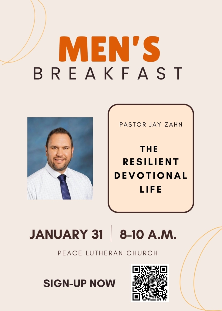 On Saturday, January 31, 8:00-10:00 am we’ll be hosting a Men’s Breakfast. All men (members of Peace and friends of Peace) are invited. The Resilient Devotional Life – with guest presenter Pastor Jason Zahn. The morning will include an opening devotion, breakfast and interactive presentation. Sign up HERE.