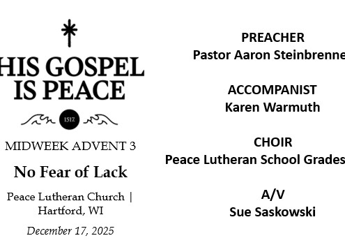 Krista Howard2025-12-18 19:23:532025-12-18 19:23:58Dec 17, 2025 – Midweek Advent 3The sermons delivered by the pastors of Peace are based on God’s Word. The video as well as a full transcript is available. Please feel free to share.